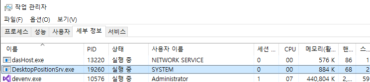 C:\>DesktopPositionSrv.exe s 를 입력하고 엔터